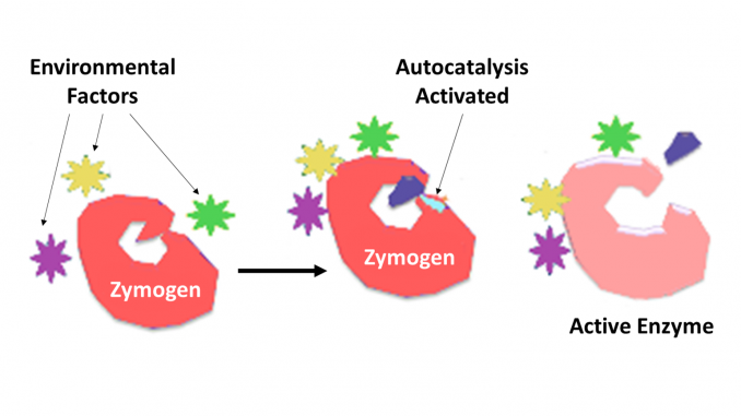 Zymogen, also called proenzyme, any of a group of proteins that display no catalytic activity but are transformed within an organism into enzymes, especially those that catalyze reactions involving the breakdown of proteins. The biochemical change usually occurs in Golgi bodies, where a specific part of the precursor enzyme is cleaved in order to activate it. The inactivating piece which is cleaved off can be a peptide unit, or can be independently folding domains comprising more than 100 residues. Although they limit the enzyme’s ability, these n-terminal extensions of the enzyme or a “prosegment” often aid in the stabilizing and folding of the enzyme they inhibit.
